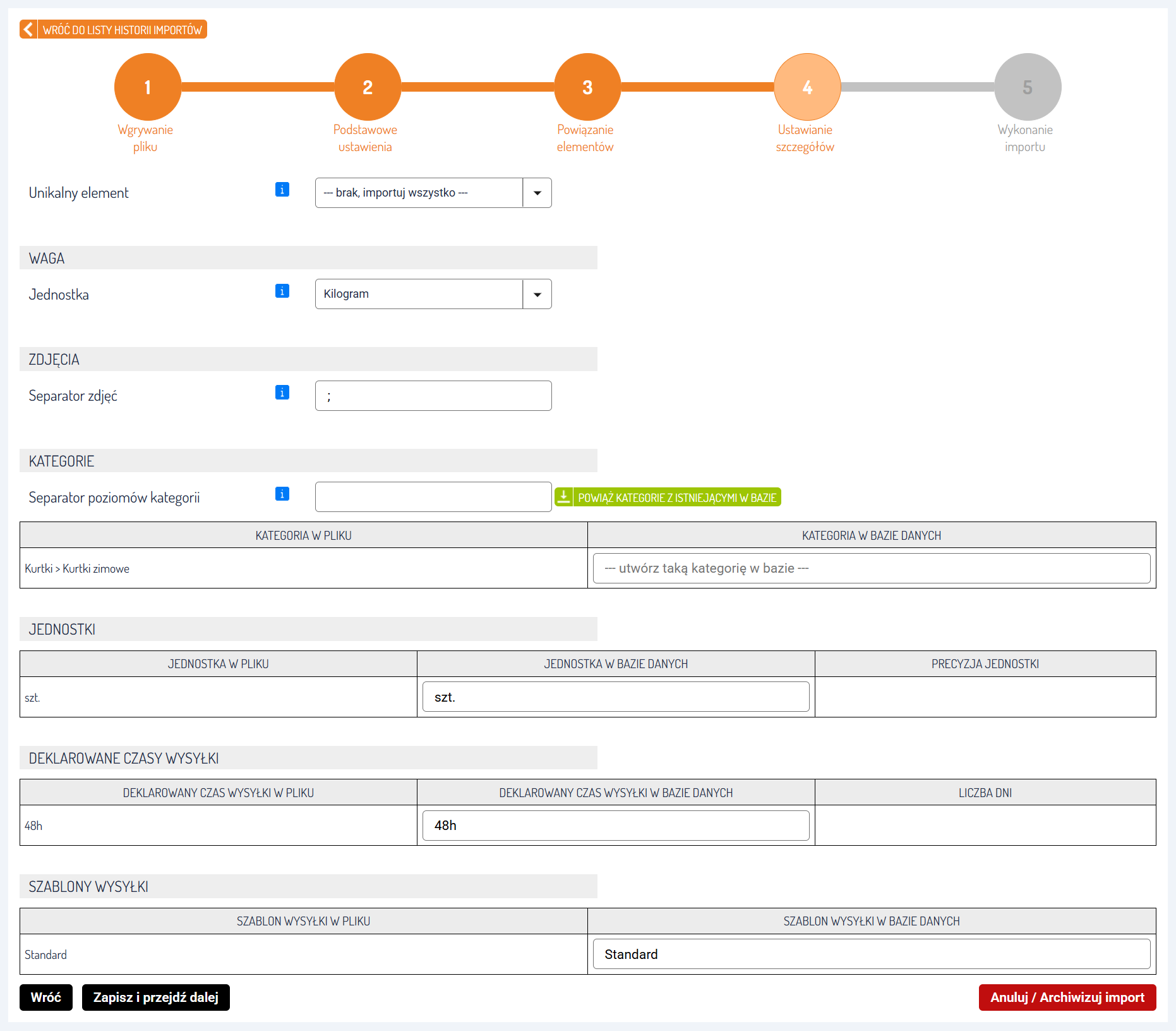 Po przypisaniu wszystkich pól, kliknij przycisk Zapisz i przejdź dalej.