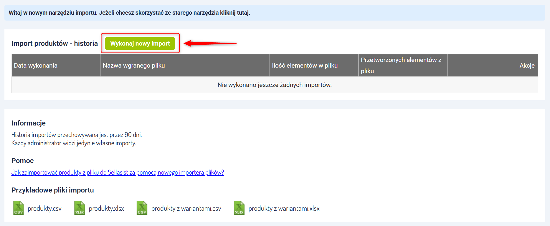 Przejdź do Asortyment → Import produktów i kliknij przycisk Wykonaj nowy import.