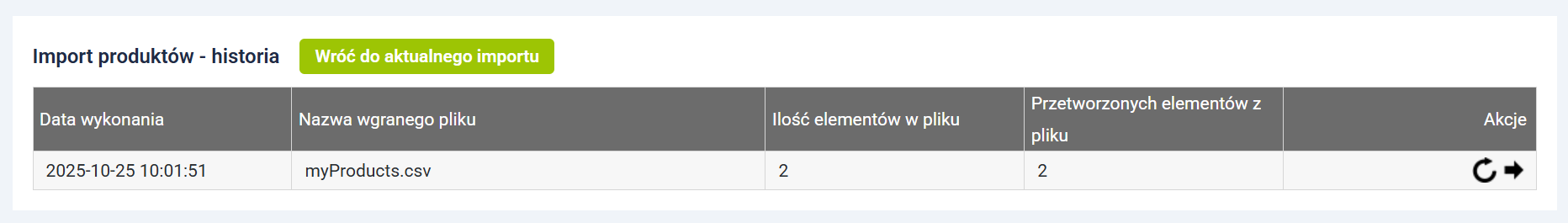 Listę wszystkich operacji znajdziesz na karcie importów (Asortyment → Import produktów). Jeśli chcesz, w kolumnie Akcje możesz zobaczyć szczegóły danego importu czy aktualizacji albo skopiować ustawienia i wykorzystać ponownie podczas następnego procesu.