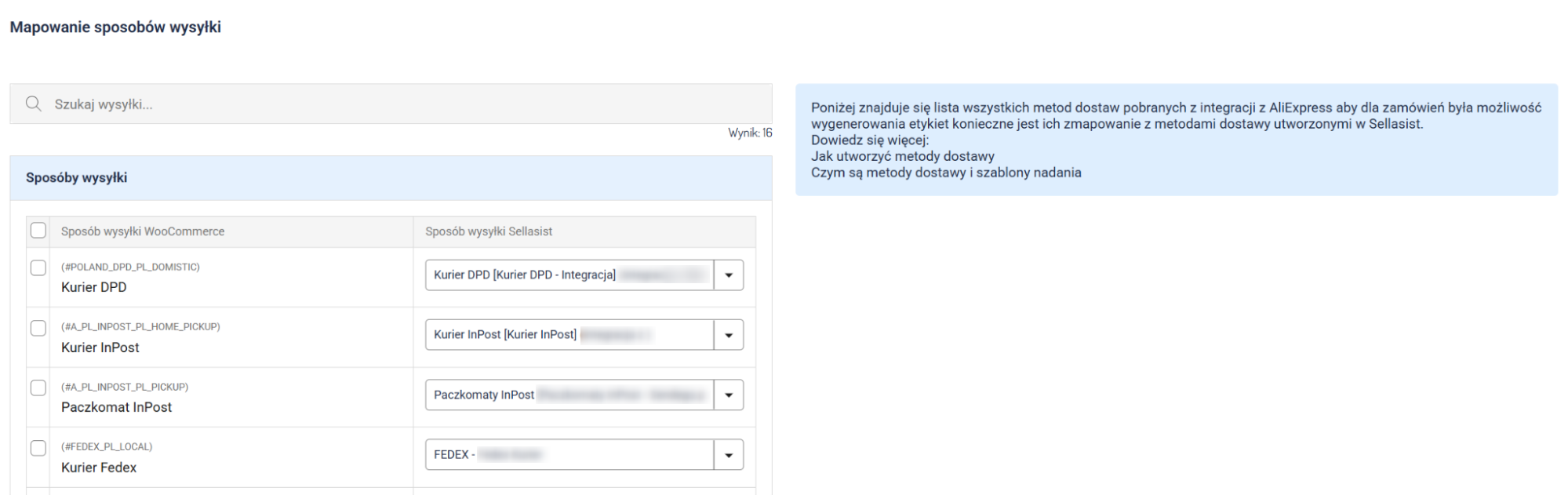 powiązać sposoby wysyłki dostępne na marketplace lub w sklepie internetowym z tymi, które wcześniej utworzyłeś w Sellasist. Dzięki temu, gdy kupujący wybierze określoną metodę dostawy, w zamówieniu automatycznie pojawi się jej odpowiednik przypisany przez Ciebie. Ułatwia to obsługę zamówień, generowanie etykiet i zachowanie spójności danych w systemie.