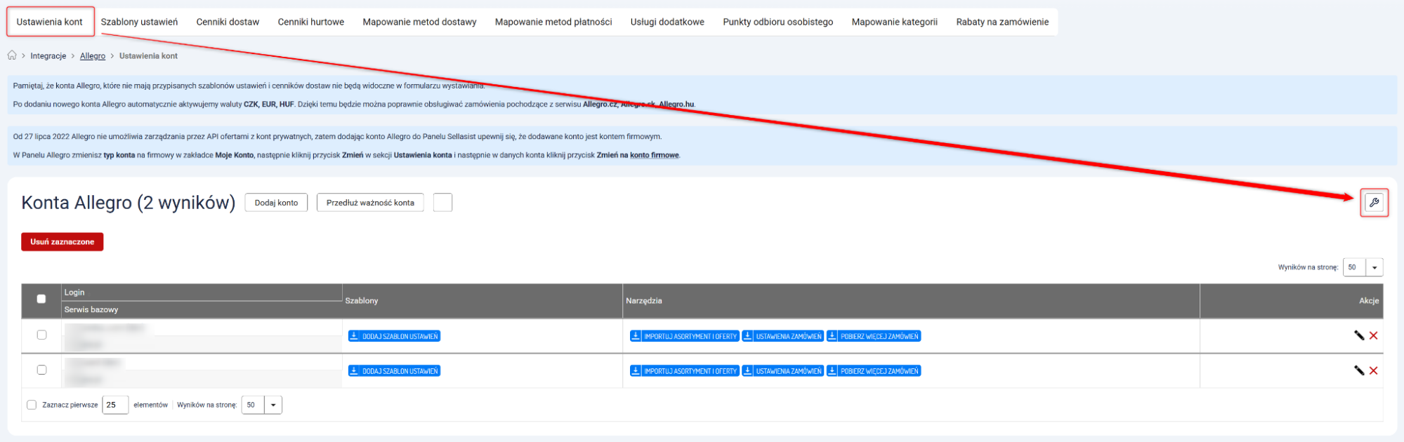 1. Przejdź do Integracje → Allegro → Ustawienia kont i kliknij przycisk z ikoną klucza.