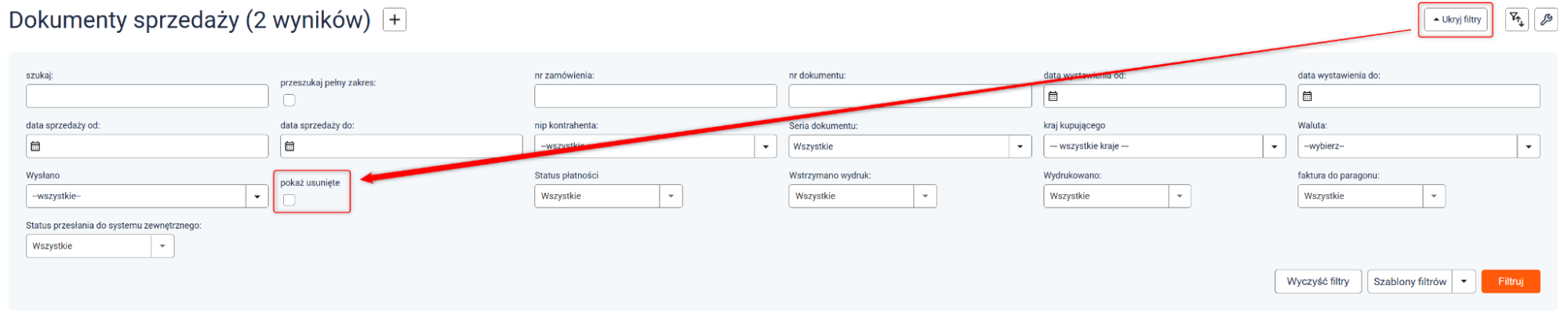 Uwaga: Usunięte dokumenty nie są trwale usuwane — trafiają do archiwum. Aby je wyświetlić, kliknij Pokaż filtr i zaznacz opcję Pokaż usunięte.