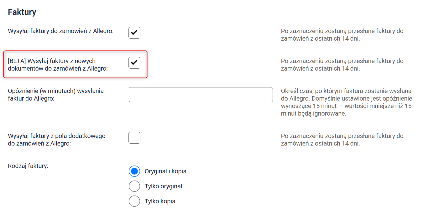2. W sekcji Faktury zaznacz checkbox [Beta] Wysyłaj faktury z nowych dokumentów do zamówień z Allegro.
