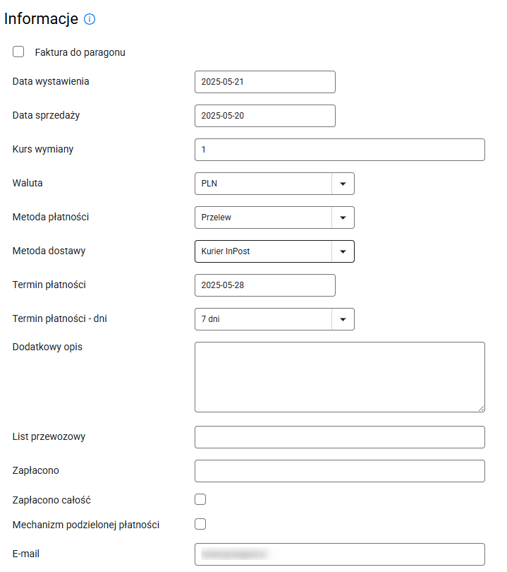 4. W sekcji Informacje uzupełnij dane dotyczące dokumentu (np. data, numer serii, sposób płatności).