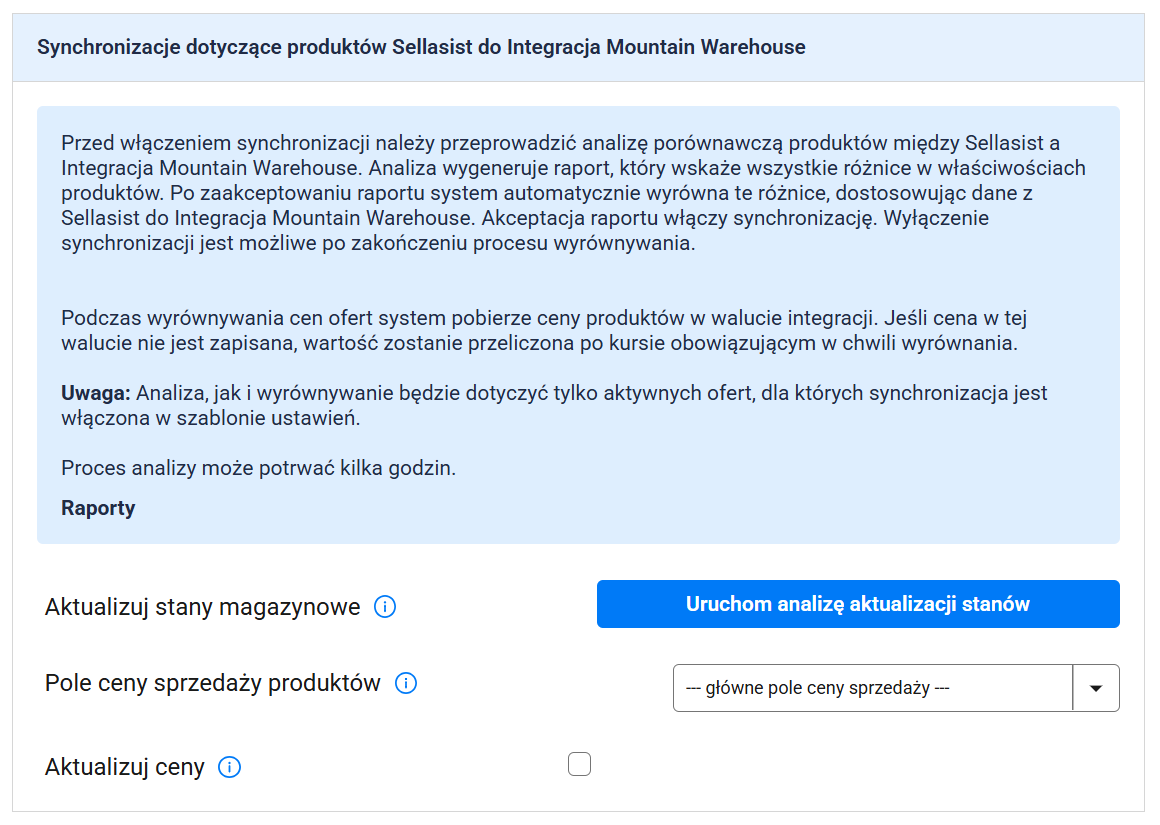 Uwaga: Oferty zostaną zsynchronizowane tylko wtedy, gdy w szablonie ustawień (krok 4) włączyłeś synchronizację stanów magazynowych oraz posiadasz przynajmniej jedną ofertę na Mountain Warehouse. Głównym źródłem stanów magazynowych i cen są produkty. Jeśli w systemie znajdują się importowane oferty powiązane z produktem, ich wartości zostaną wyrównane do danych zapisanych w produkcie — i w ofercie Sellasist, i w ofercie integracji.