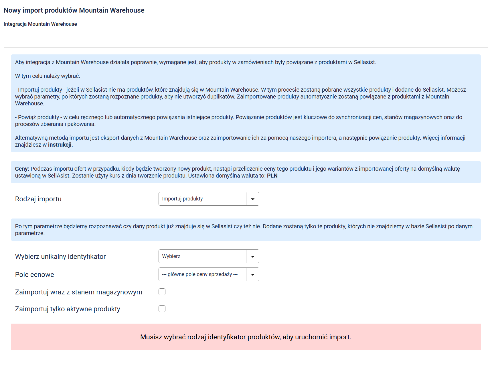 - Wybierz unikalny identyfikator: Parametr, po którym system będzie powiązywał produkty istniejące w Sellasist z produktami w Mountain Warehouse. Jeśli w Sellasist znajdzie się kilka pozycji z tym samym identyfikatorem, integracja zostanie przypisana do produktu o najniższym ID. Produkty, których nie uda się powiązać, zostaną wskazane w raporcie.