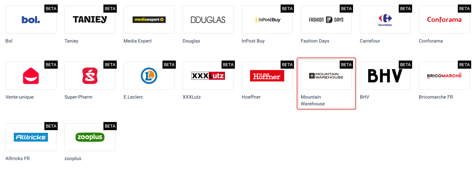 1. Przejdź do Integracje → Dodaj nową integrację i w sekcji Marketplace wybierz Mountain Warehouse.