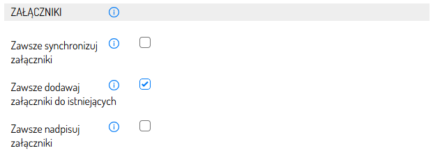 Zawsze dodawaj załączniki do istniejących – Typy załączników, które nie są ustawione produkcie z asortymentu, ale są ustawione w ofercie Allegro, nie będą usuwane.