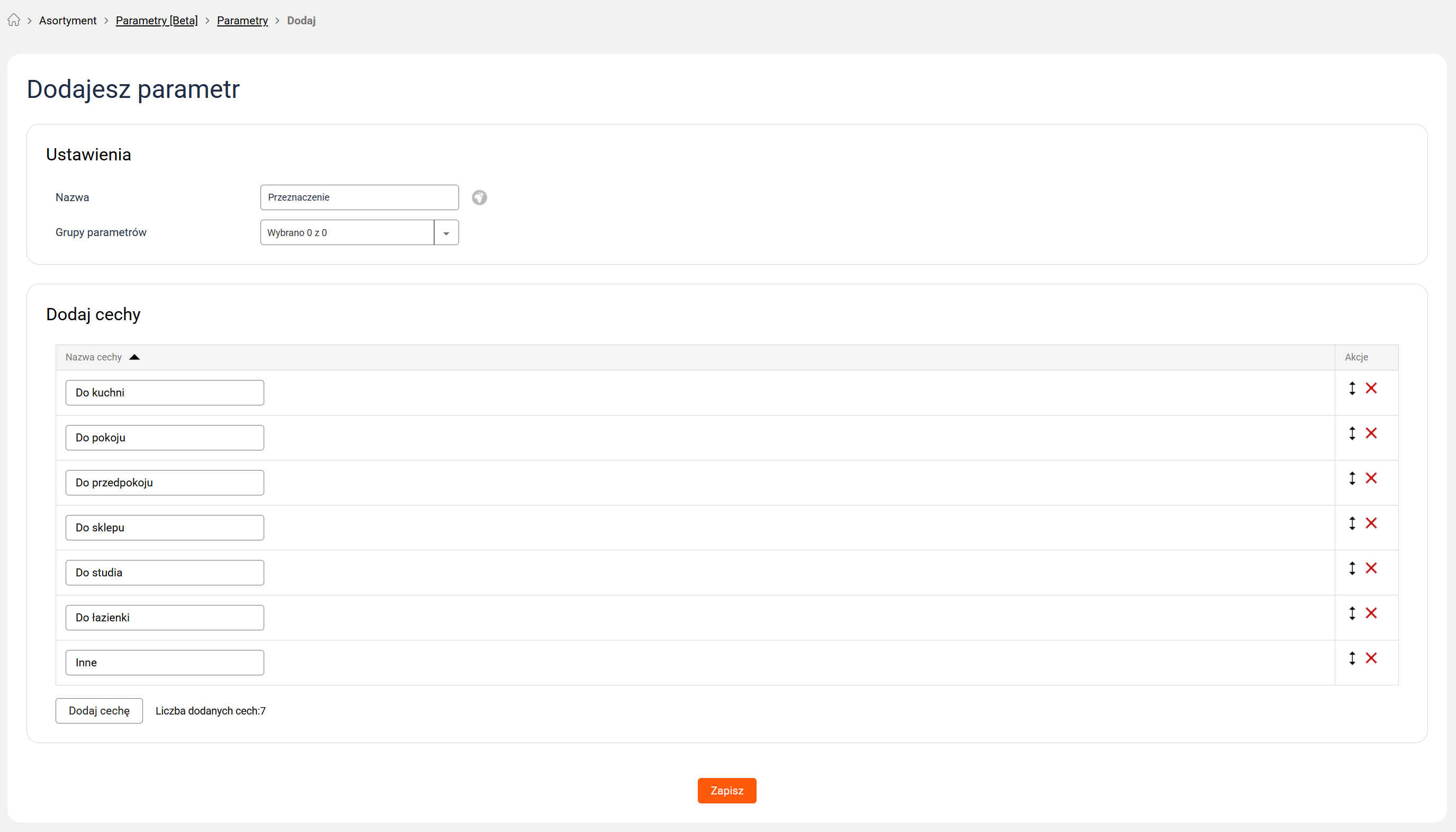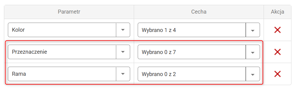 W tabelce dodane zostaną wszystkie parametry, jakie były przypisane do danej grupy. Dla każdego parametru wybierz konkretne cechy produktu.