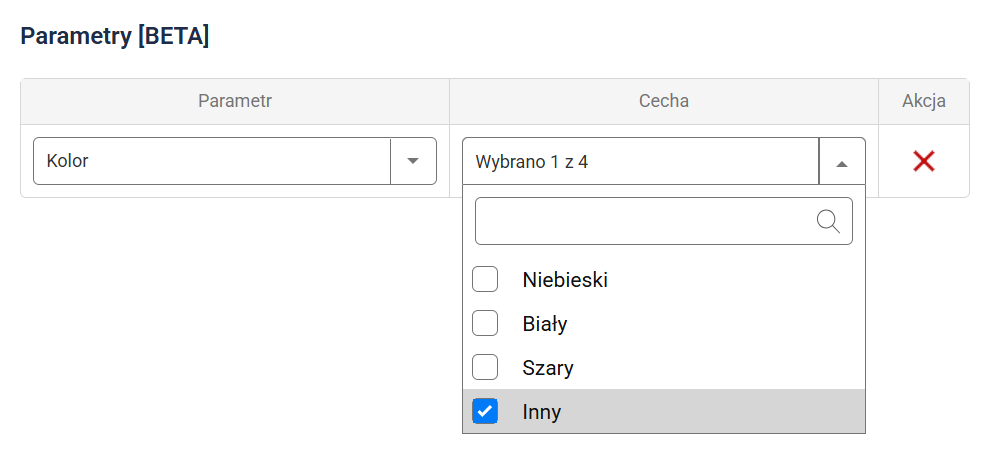 Kliknij przycisk Dodaj parametr. Na ekranie zobaczysz tabelkę. Wybierz z niej parametr i konkretne cechy produktu.