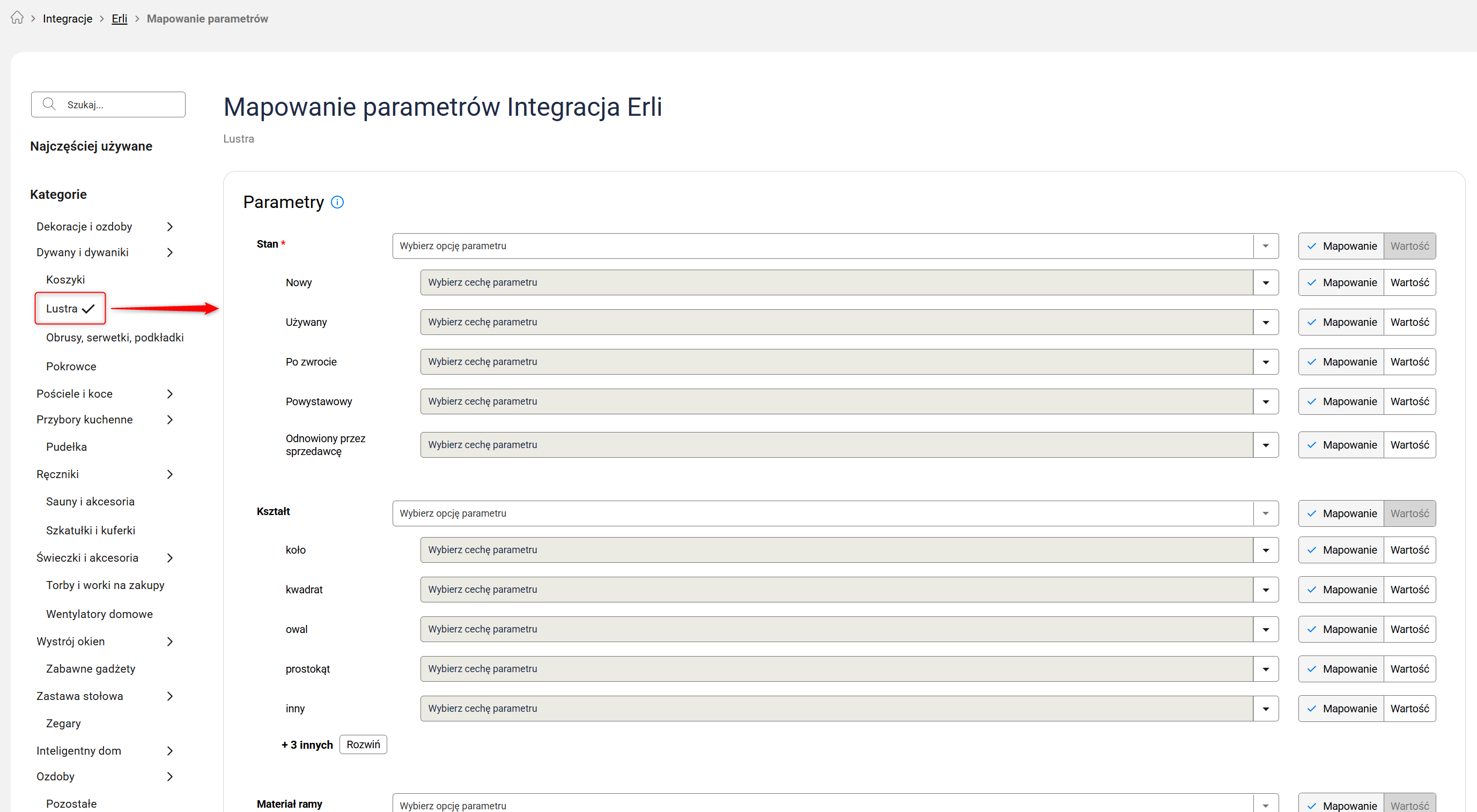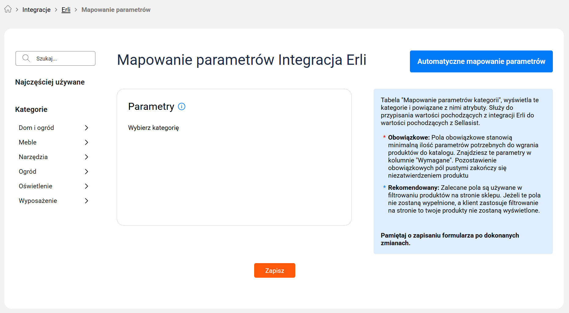 2. Na ekranie zobaczysz narzędzie mapowania parametrów z podziałem na listę kategorii dostępnych w Twoim sklepie oraz okno z parametrami dla konkretnej, wybranej kategorii.