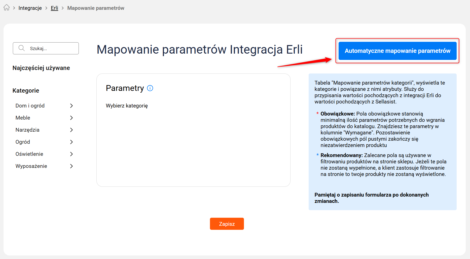 1. Aby automatycznie zmapować parametry w Sellasist z parametrami w Twoim sklepie, w narzędziu mapowania znajdź i kliknij przycisk Automatyczne mapowanie parametrów.
