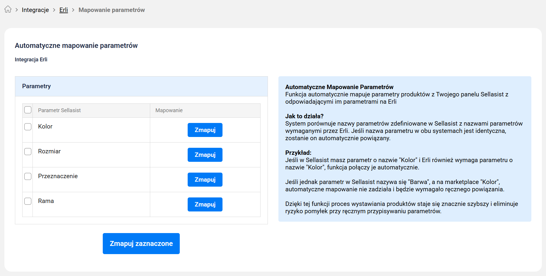 2. Na ekranie zobaczysz formularz automatycznego mapowania parametrów. Zmapuj parametry pojedynczo lub zaznacz wybrane i kliknij przycisk Zmapuj zaznaczone.
