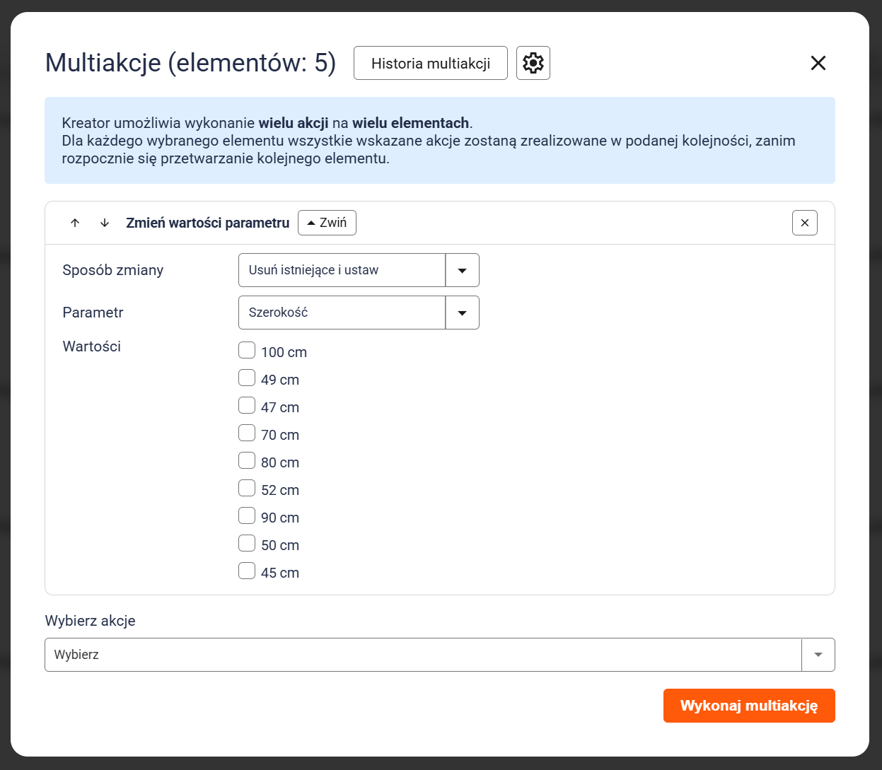 2. Na ekranie zobaczysz okno ustawień multiakcji. Z rozwijanej listy wybierz akcję Zmień wartości parametru, a następnie zmodyfikuj parametr według własnych potrzeb.