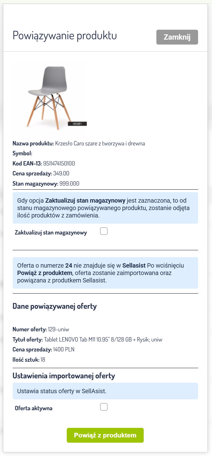 4. Zdecyduj, czy chcesz zaktualizować stan magazynowy i aktywować ofertę, po czym kliknij przycisk Powiąż z produktem (ilość ustawień może się różnić w zależności od specyfiki produktu lub sklepu/marketplace).