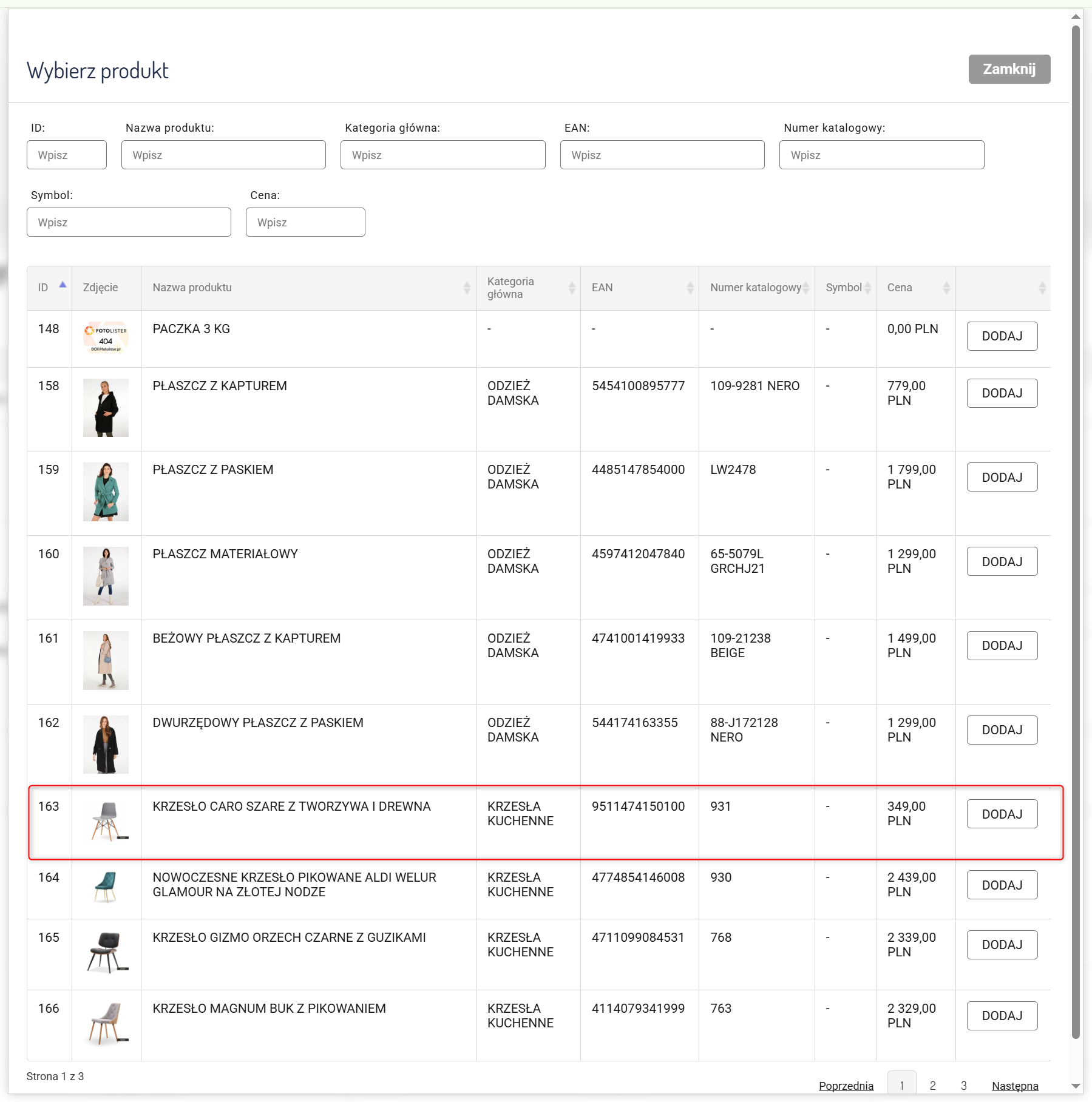 3. Na ekranie zobaczysz okno z listą produktów możliwych do powiązania z wybraną ofertą. Znajdź produkt, który chcesz powiązać i kliknij przycisk Dodaj.