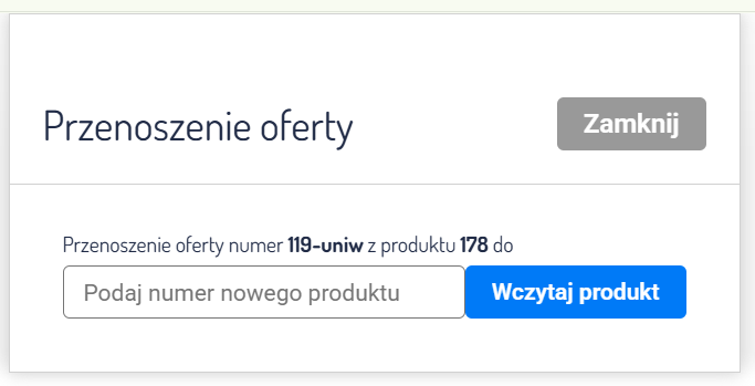 2. Na ekranie zobaczysz okno przenoszenia oferty. Wpisz ID produktu, który chcesz wystawić w ofercie i kliknij przycisk Wczytaj produkt.