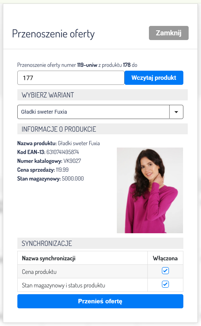 3. System wczyta produkt o podanym ID. Wybierz jego wariant (jeśli istnieje), zaznacz wybrane opcje synchronizacji i kliknij przycisk Przenieś ofertę (ilość ustawień może się różnić w zależności od specyfiki produktu lub sklepu/marketplace).