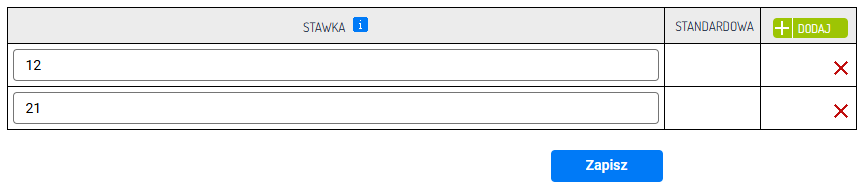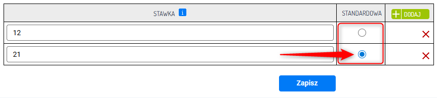 5. Po zapisaniu zmian możesz wybrać, która stawka ma być uznawana za standardową. Zapisz wprowadzone zmiany.