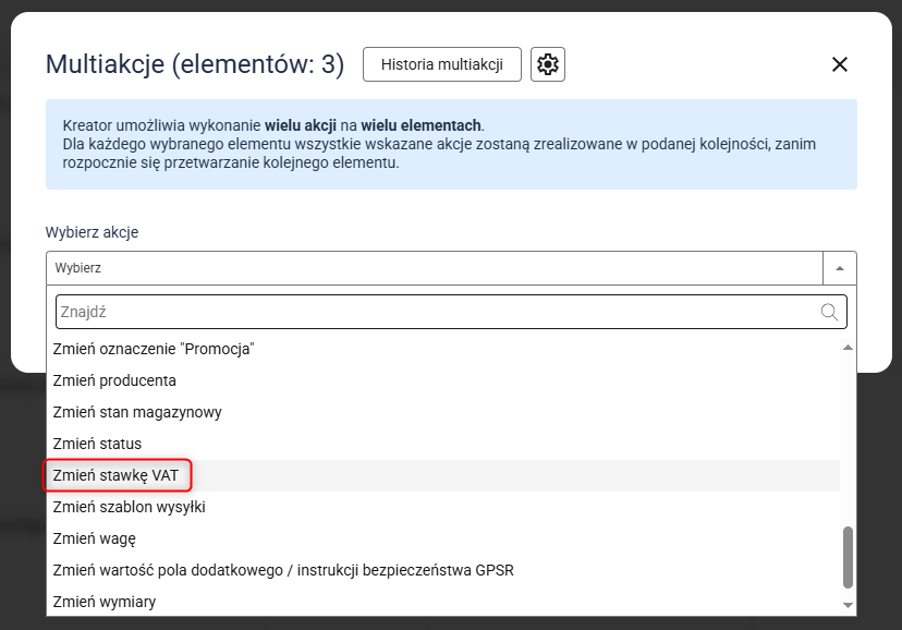 Po zakończeniu multiakcji, wybrane produkty otrzymają właściwą stawkę VAT zgodnie z konfiguracją.