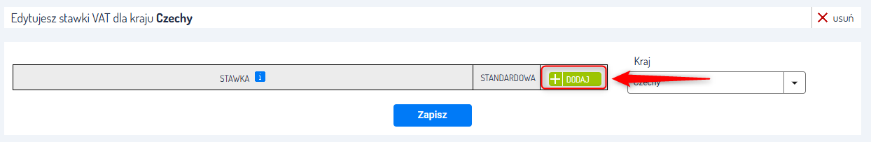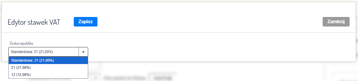 3. Na ekranie zobaczysz edytor stawek VAT. Ustaw wybraną stawkę dla produktu w zależności od kraju i kliknij przycisk Zapisz.