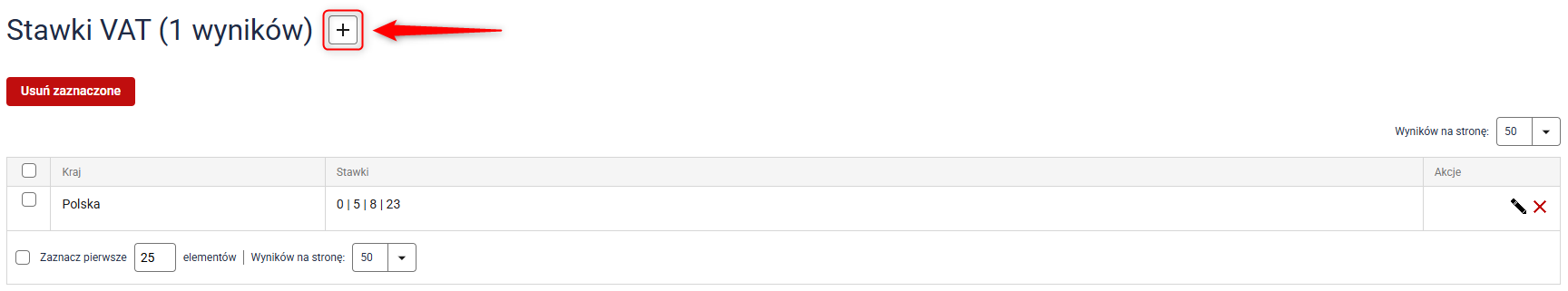 1. Przejdź do Administracja → Stawki VAT i kliknij przycisk z ikoną plusa.