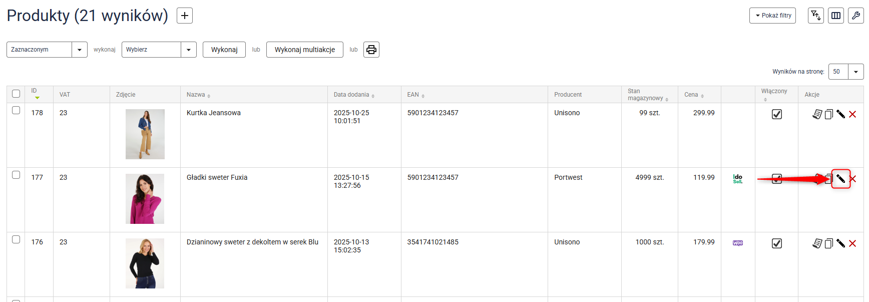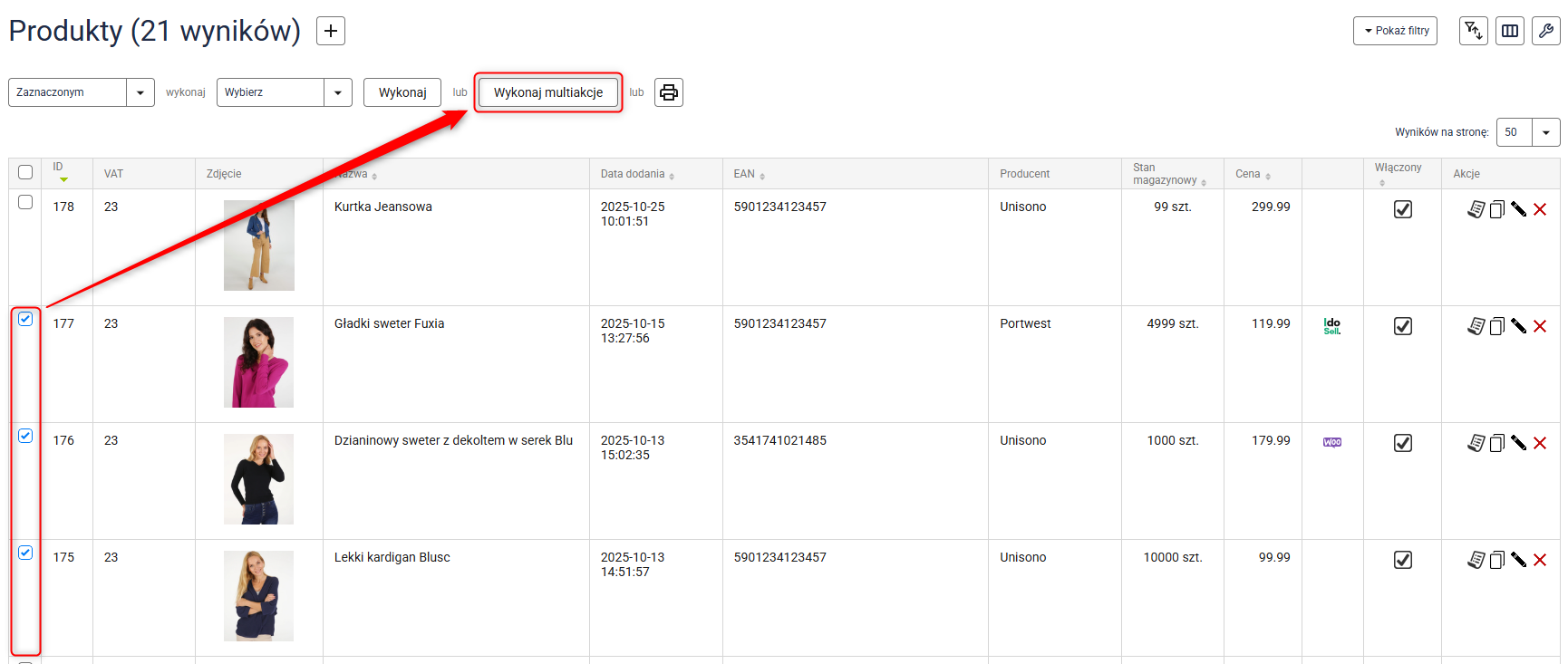 1. Przejdź do Asortyment → Produkty, zaznacz wszystkie produkty, którym chcesz przypisać stawki VAT i kliknij przycisk Wykonaj multiakcje.