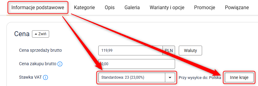 2. W sekcji Informacje podstawowe przejdź do sekcji Cena. Z rozwijanej listy wybierz stawkę VAT dla kraju głównego. Następnie kliknij przycisk Inne kraje.