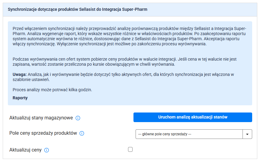 • Aktualizuj stany magazynowe: Uruchomienie synchronizacji stanów magazynowych produktów Sellasist → Super-Pharm. Więcej na temat analizy aktualizacji stanów dowiesz się z następnego akapitu.