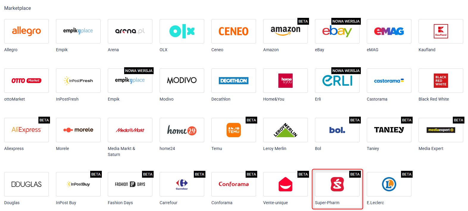 1. Przejdź do Integracje → Dodaj nową integrację i w sekcji Marketplace wybierz Super-Pharm.