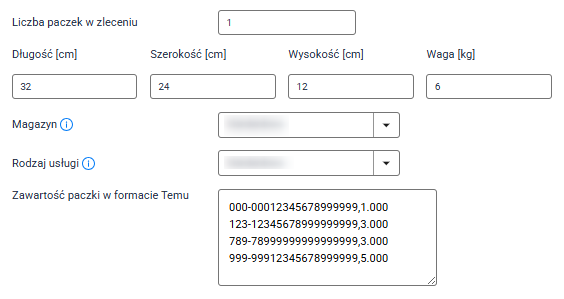 3. Dla każdej paczki wybierz Magazyn i Rodzaj usługi.