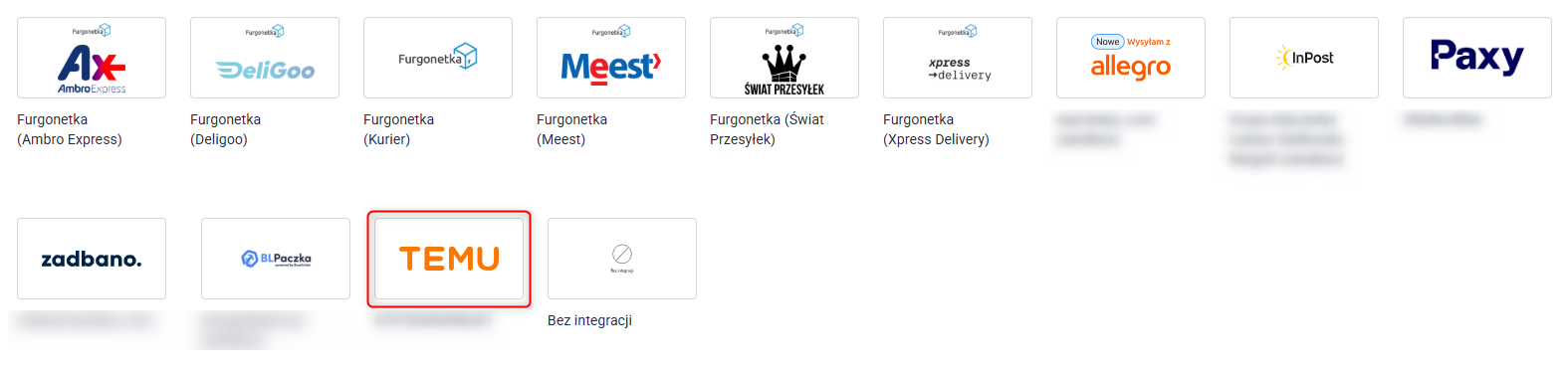 2. Z listy dostępnych integracji kurierskich wybierz Temu (Beta).