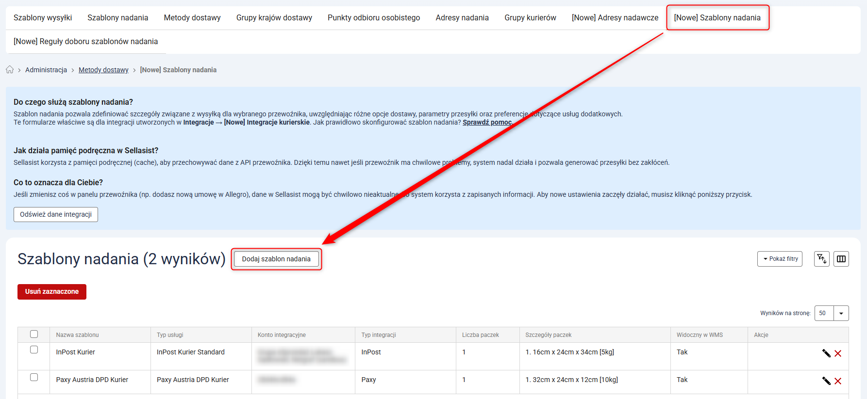 1. Przejdź do Administracja → Metody dostawy → [Nowe] Szablony nadania i kliknij przycisk Dodaj szablon nadania.