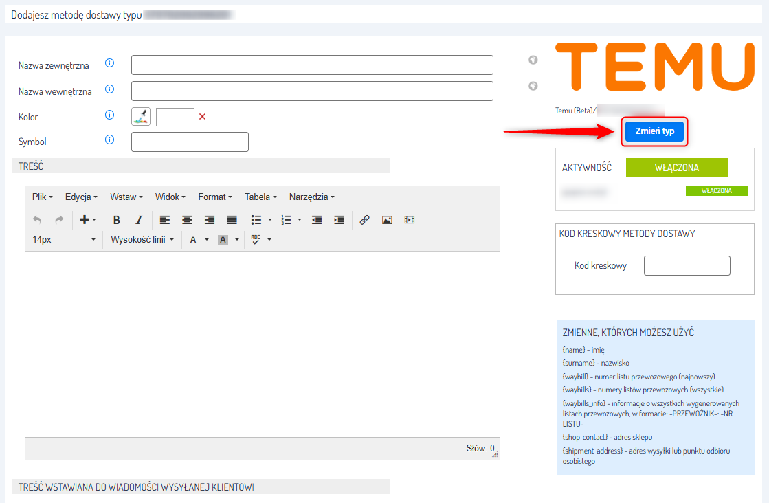 3. Na ekranie zobaczysz formularz tworzenia nowej metody dostawy. Zmień typ usługi na właściwy Twojemu szablonowi nadania i skonfiguruj wszystkie ustawienia według własnych potrzeb.