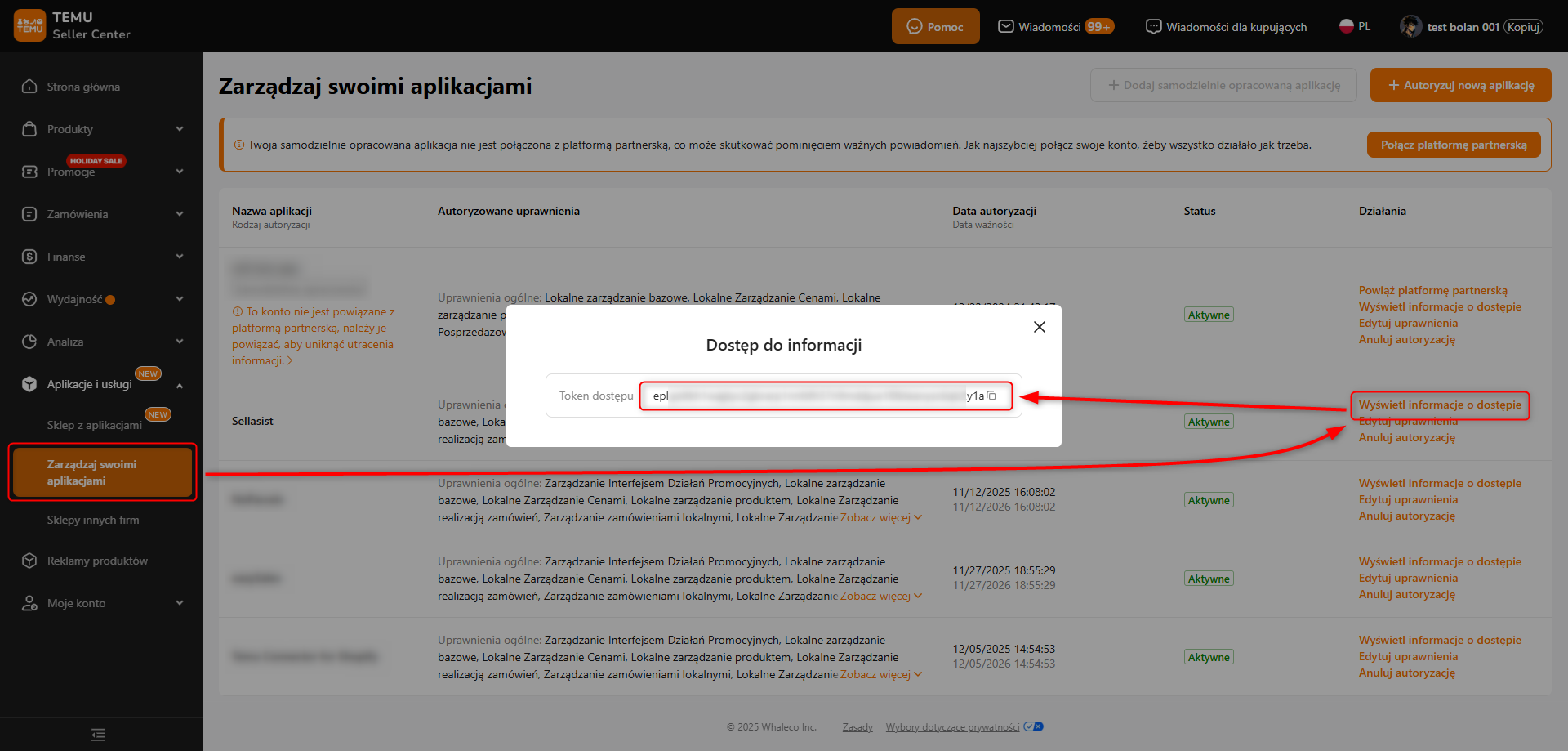 - Klucz dostępowy: Klucz do autoryzacji API, który znajdziesz w panelu Temu (Zarządzaj swoimi aplikacjami → Wyświetl informacje o dostępie aplikacji Sellasist)