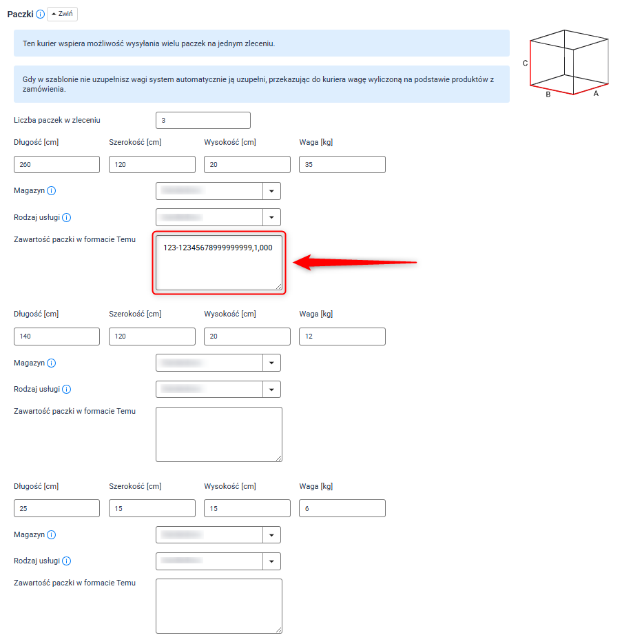 2. Dla każdej paczki uzupełnij pola Długość, Szerokość, Wysokość i Waga — zgodnie z rzeczywistymi parametrami poszczególnych paczek.