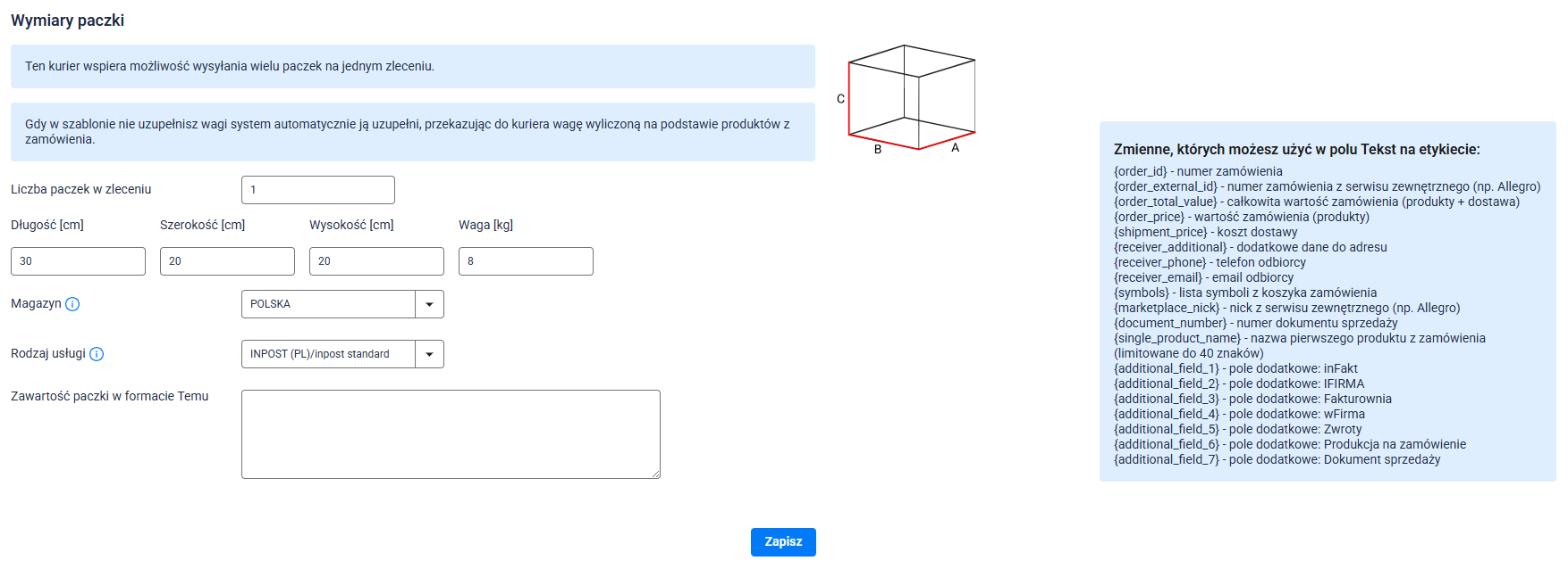 2. Uzupełnij pole Długość, Szerokość, Wysokość i Waga — zgodnie z rzeczywistymi parametrami paczki.