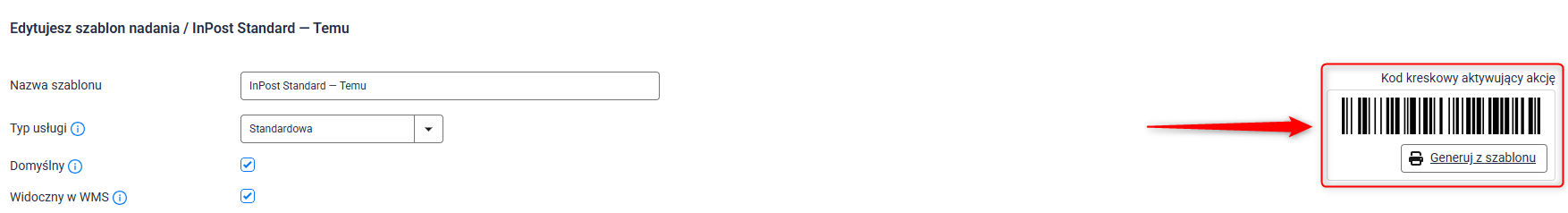 5. Po zapisaniu szablonu, w górnej sekcji pojawi się unikalny kod kreskowy.