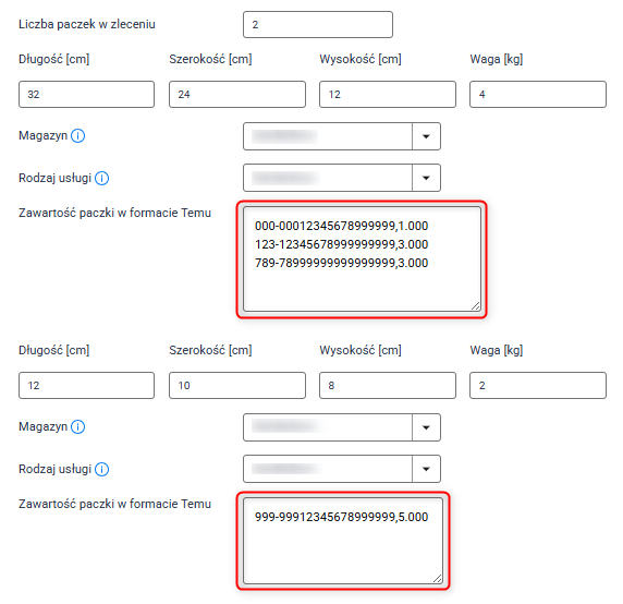 4. Dla każdej paczki, w polu Zawartość paczki w formacie Temu wpisz ID produktu z koszyka i ilość sztuk, jaką chcesz umieścić w danej paczce w formacie Temu, np.: