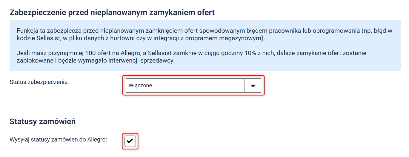 Statusy zamówień - Zaznacz, jeżeli chcesz wysyłać statusy zamówień z Sellasist do Allegro.