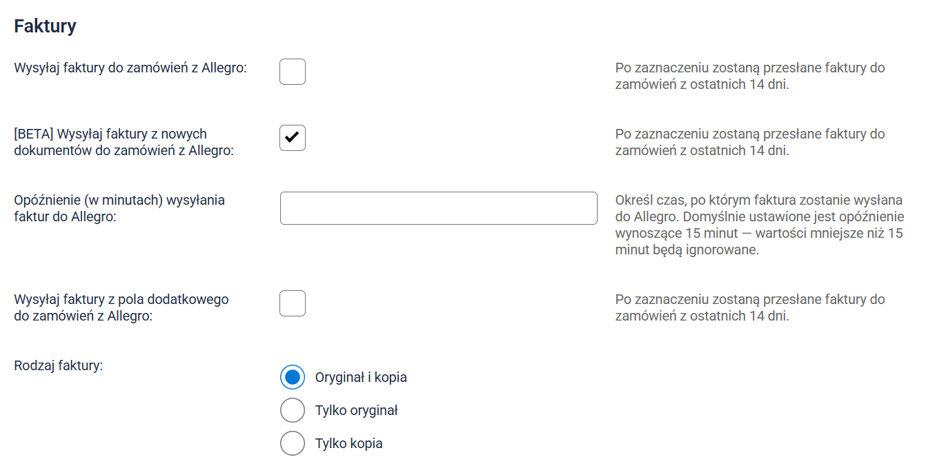 Rodzaj faktury - Wybierz jaki rodzaj faktur ma być wysyłany do Allegro: Oryginał/ kopia/ Oryginał i kopia