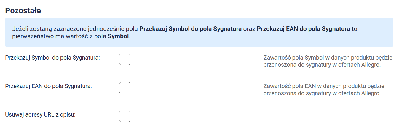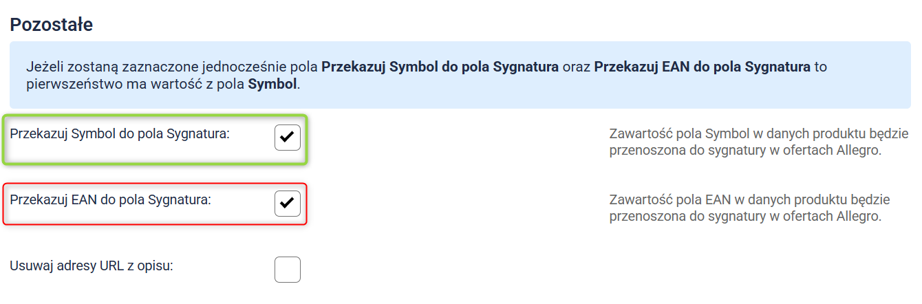 Przekazuj EAN do pola Sygnatura - Zawartość pola EAN w danych produktu będzie przenoszona do sygnatury w ofertach Allegro.