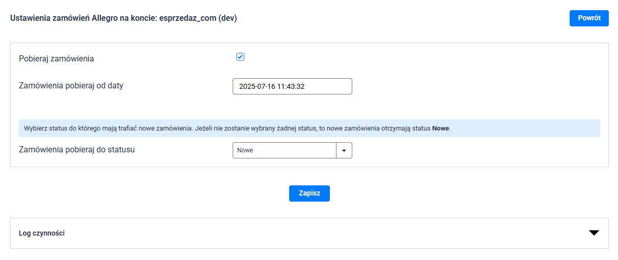 - Zamówienia pobieraj do statusu: Ustaw status w Sellasist, do którego mają trafiać zamówienia pobierane z tego konta Allegro