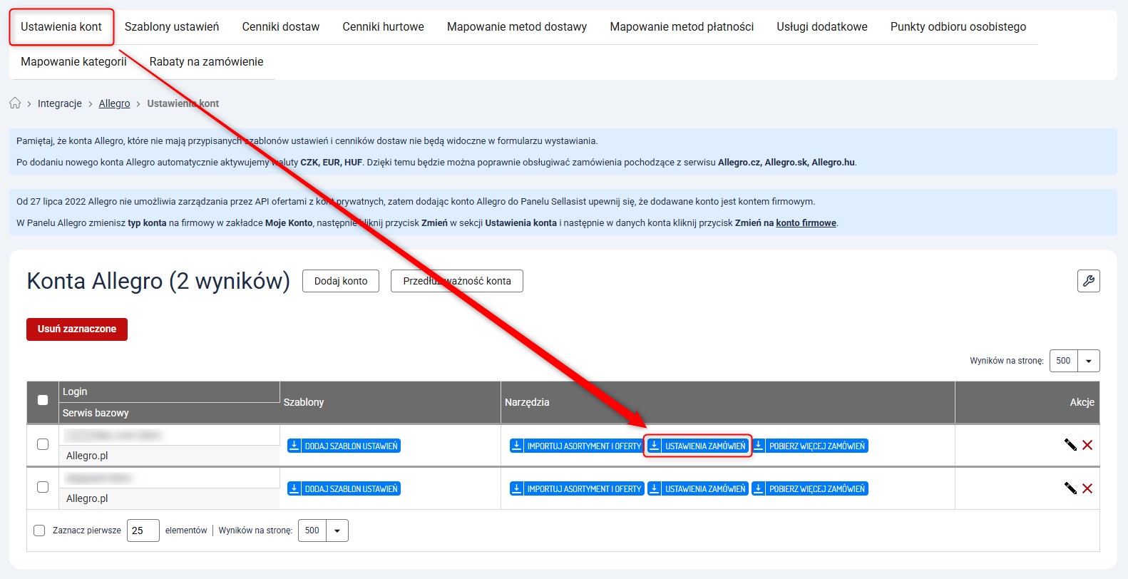 1. Przejdź do Integracje → Allegro i w sekcji Ustawienia kont otwórz Ustawienia zamówień wybranego konta.