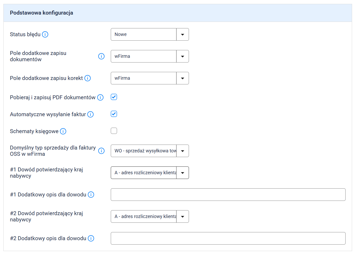 Ważne: W ramach wszystkich integracji z systemami ERP, każdy dokument można przypisać tylko raz. Jeśli w integracji z wFirma wybierzesz np. FV – Faktura, nie będziesz mógł użyć tego samego typu dokumentu w innej integracji.