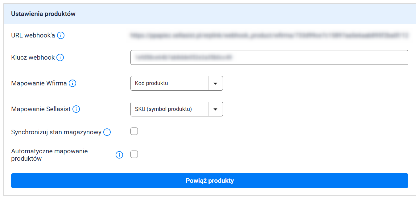 - URL webhook’a: Automatycznie generowany, specjalny rodzaj linku, działający jak kanał komunikacji między Sellasist a wFirma — niezbędny do prawidłowego przekazywania danych między systemami w celu synchronizacji produktów. Skopiuj go i wklej w ustawieniach integracji w panelu wFirma według instrukcji znajdującej się tutaj.