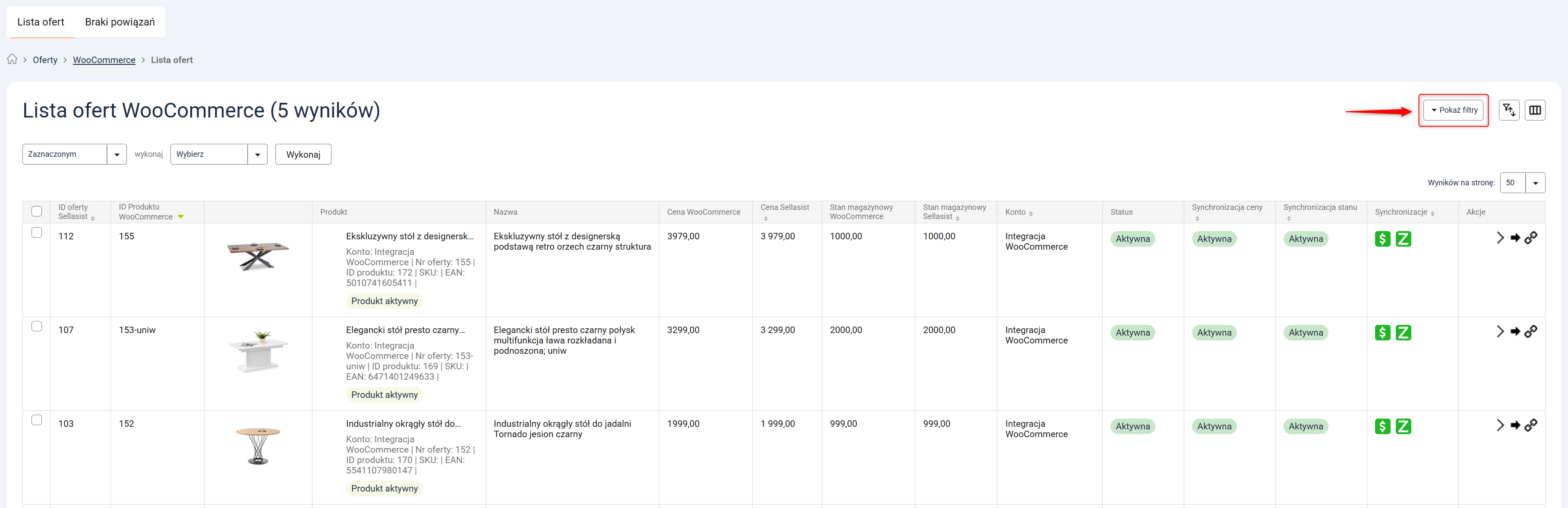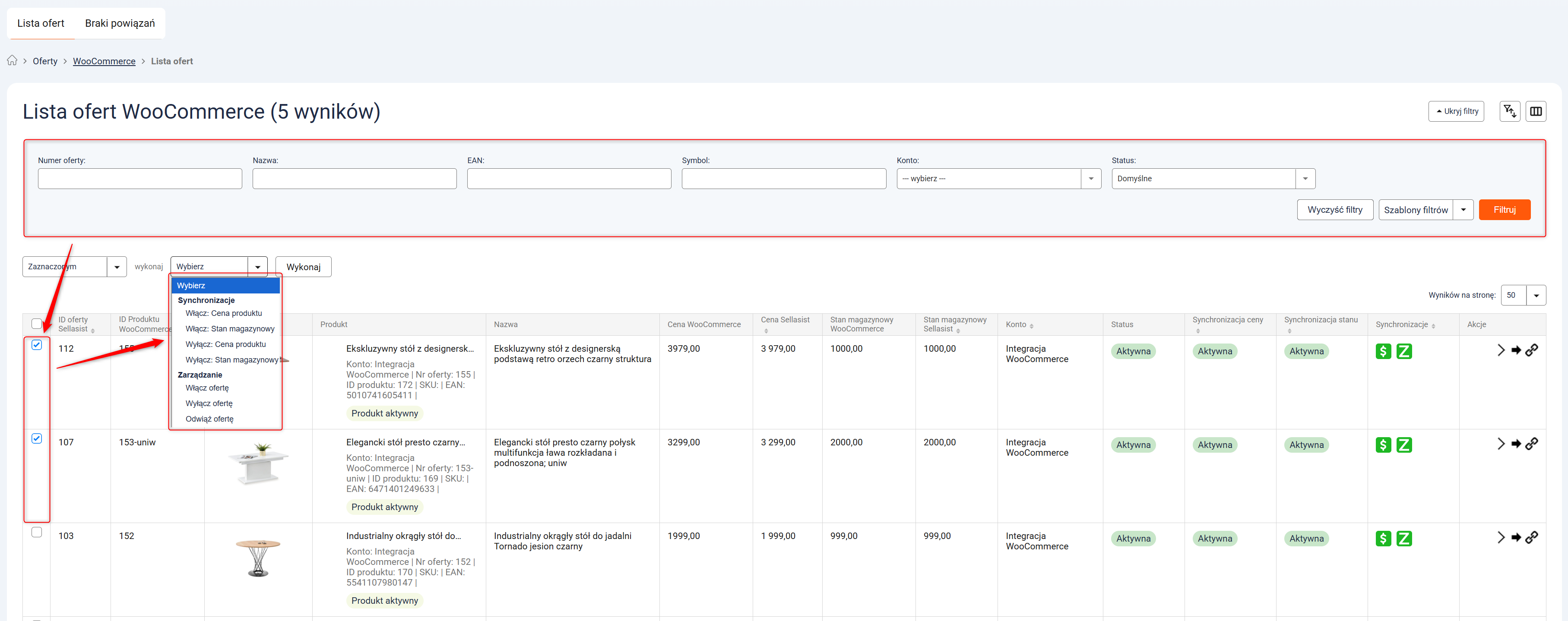 Oferty możesz przefiltrować według określonych warunków, a następnie wykonać na nich dowolne akcje masowe, np. włączenie/wyłączenie synchronizacji czy ponowne wystawienie oferty.