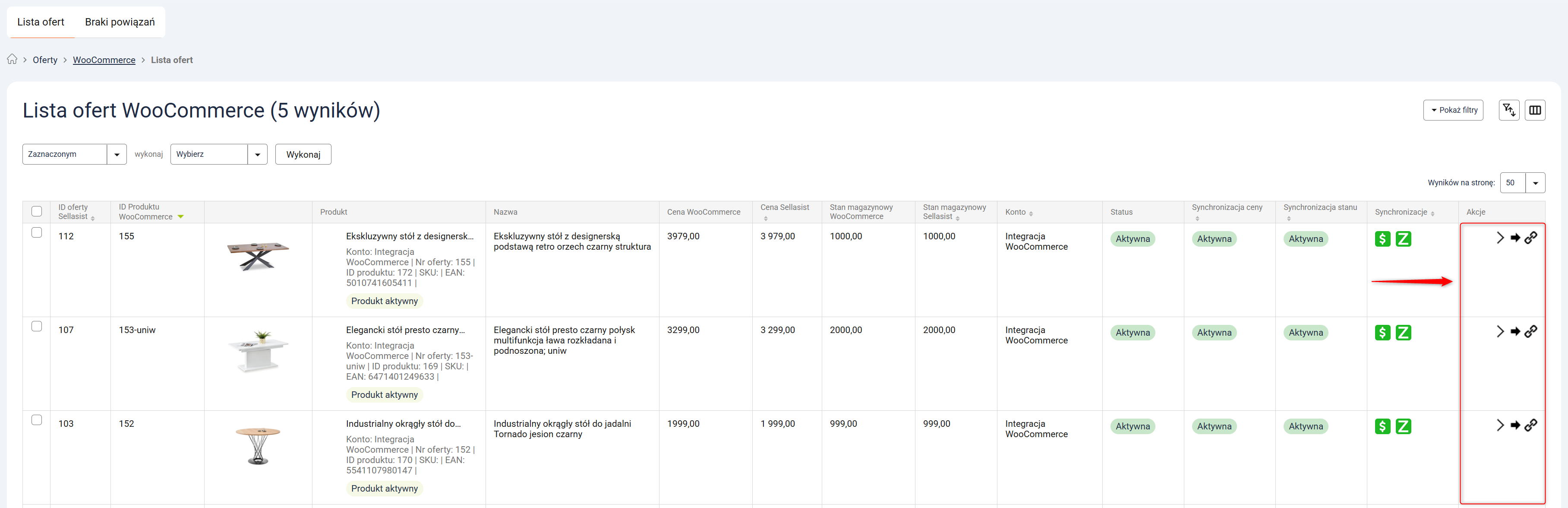 W ostatniej kolumnie znajdziesz szybkie akcje, które możesz wykonać na konkretnej ofercie, np. podgląd produktu, przeniesienie oferty czy też jej całkowite odwiązanie.